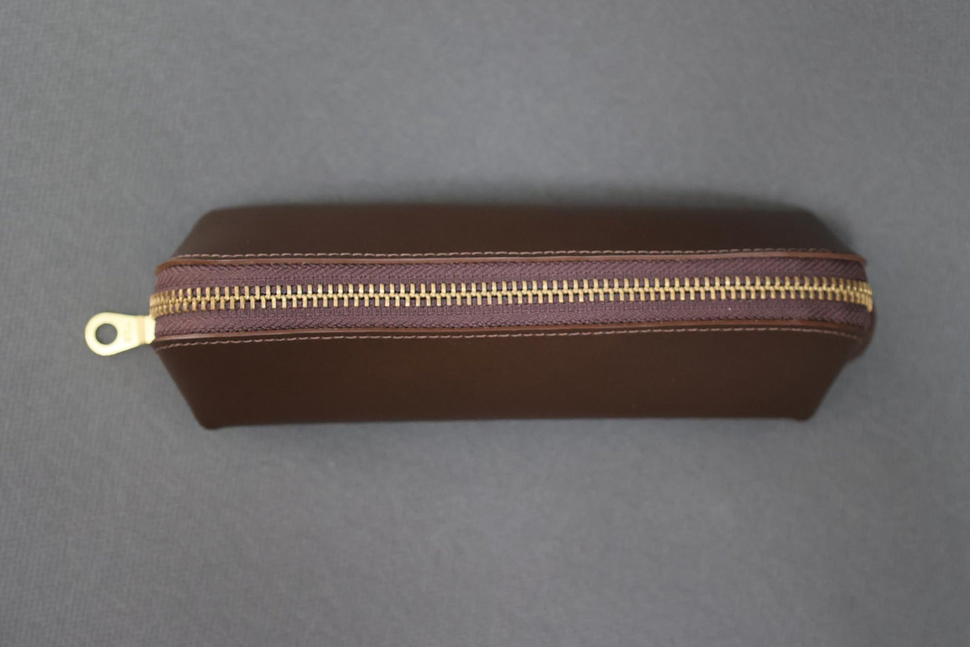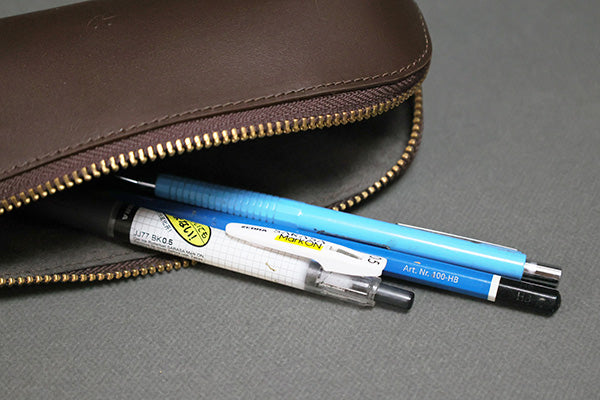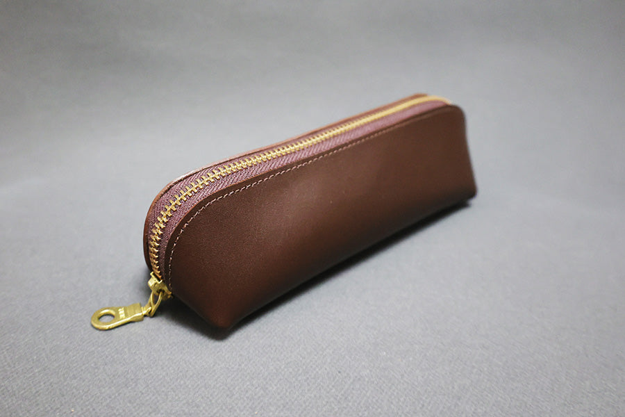This leather pencil case features premium cowhide for lasting durability and a smooth, comfortable touch. It includes a grey fabric lining that protects contents and a sturdy brass zipper for secure closure. With ample capacity, it efficiently organizes your pens and pencils, combining practicality with a refined, professional finish.